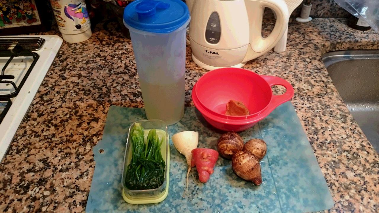 今朝は、里芋、大根、人参、ほうれん草の味噌汁です。