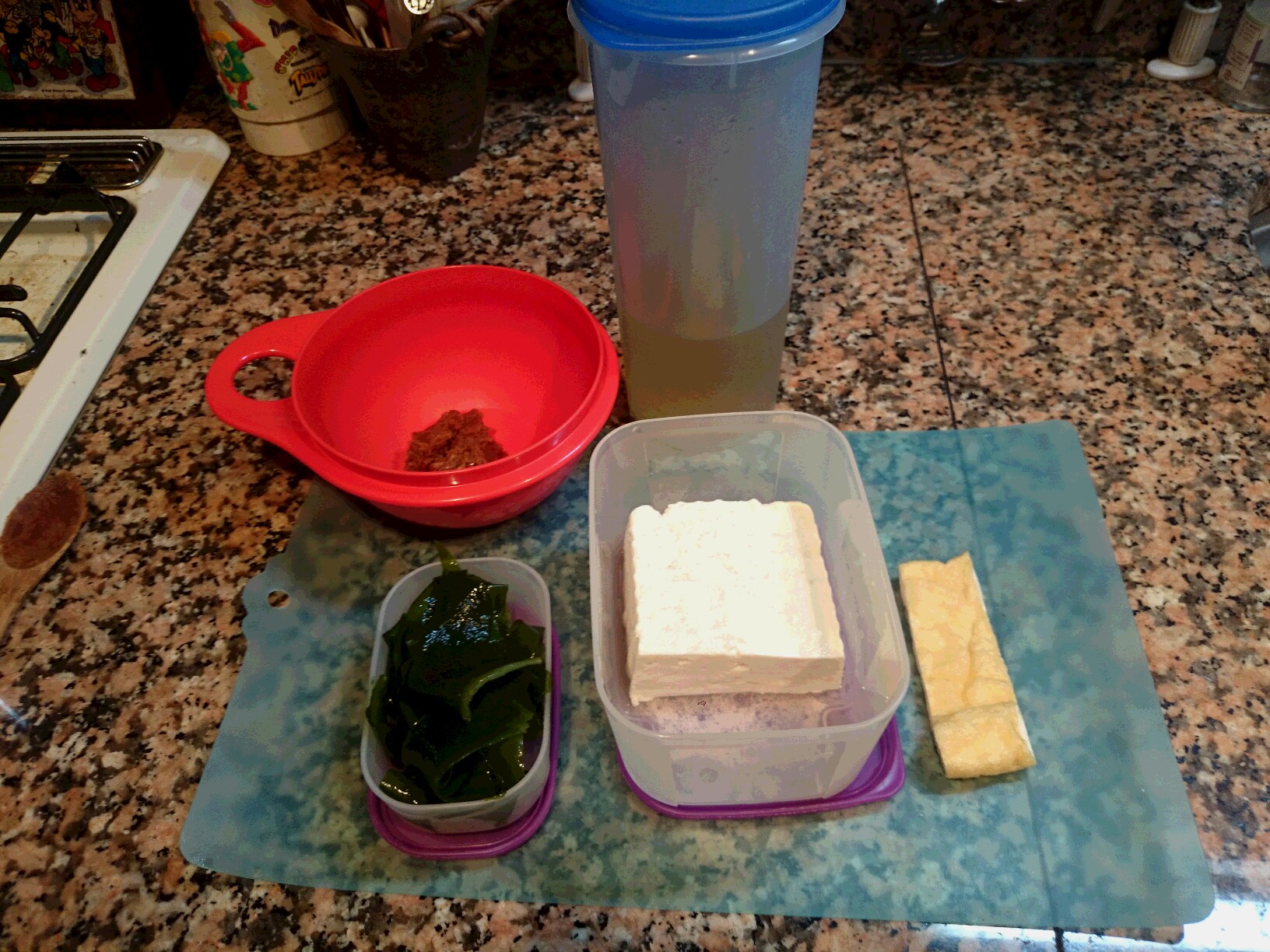今朝は、とうふ、わかめ、うすあげの味噌汁です。