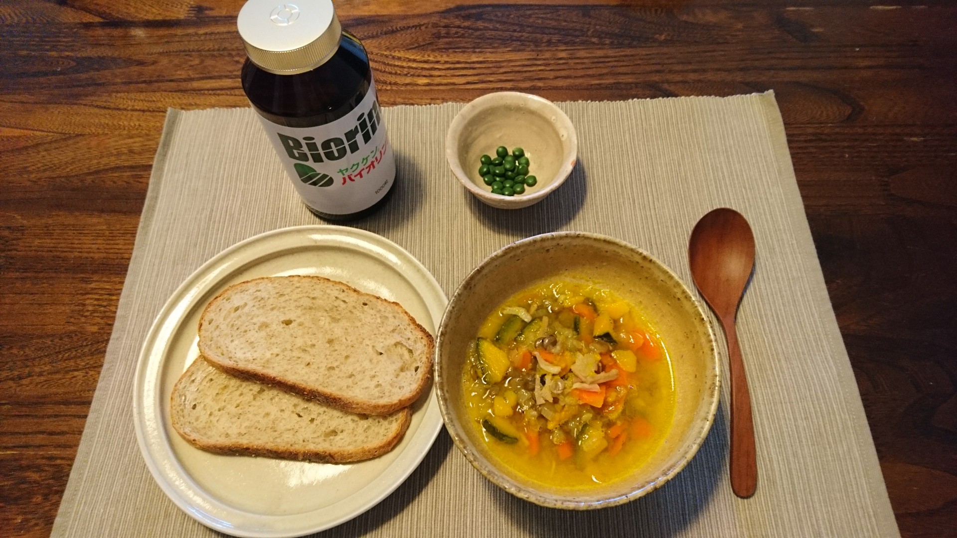 今朝は、玉ねぎ、人参、坊ちゃんかぼちゃ、ベーコン、レンズ豆のスープ。
