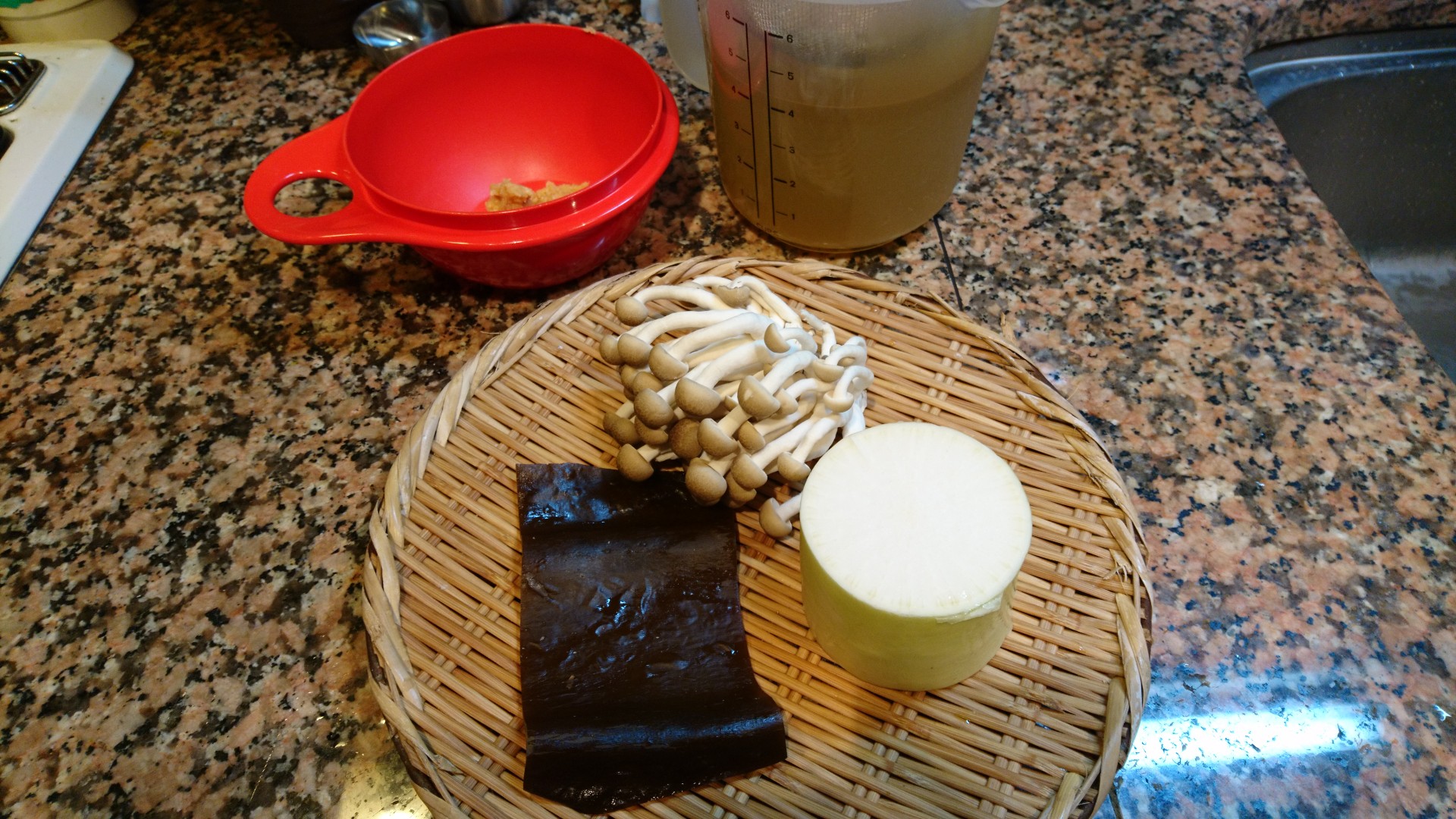 今朝は、大根、しめじ、出汁をとった後の羅臼昆布です。