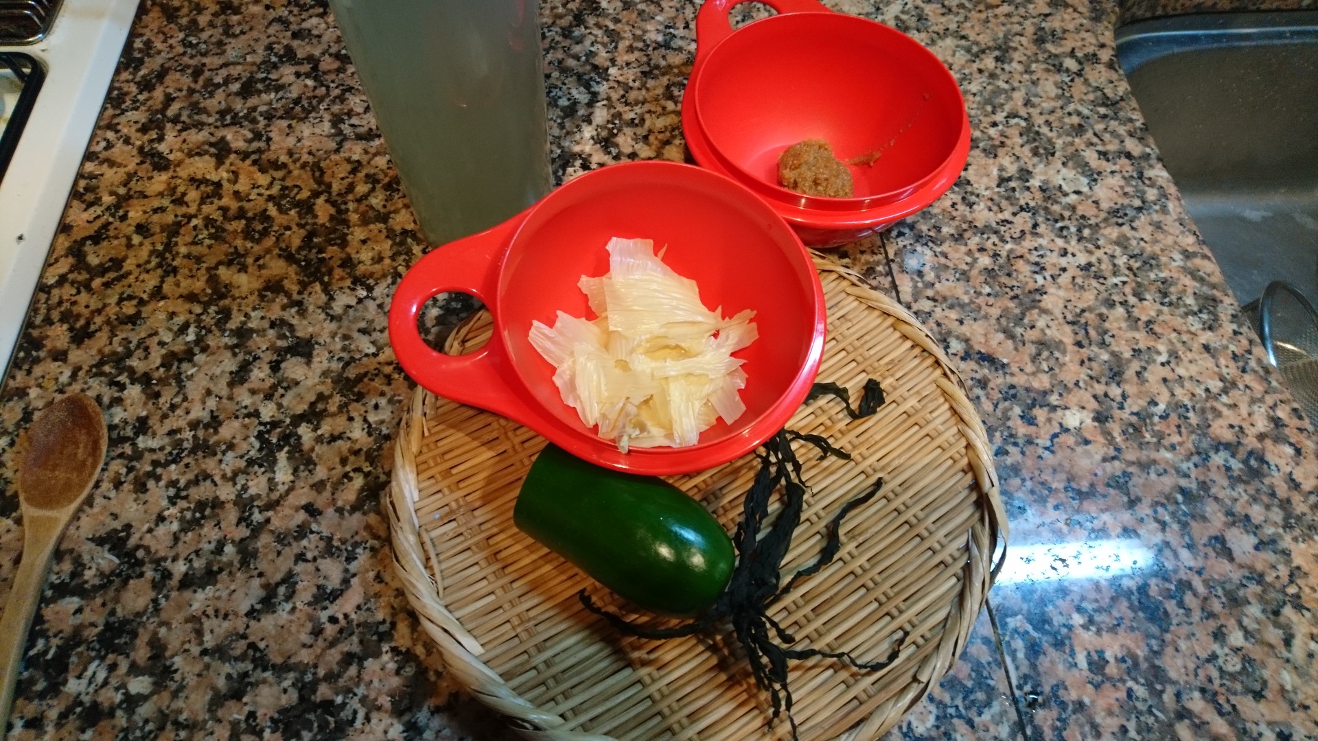 今朝は、ズッキーニ、割れ湯葉、わかめの味噌汁です。
