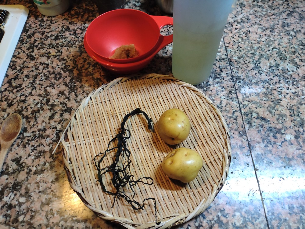 今朝は、じゃがいも、わかめの味噌汁です。