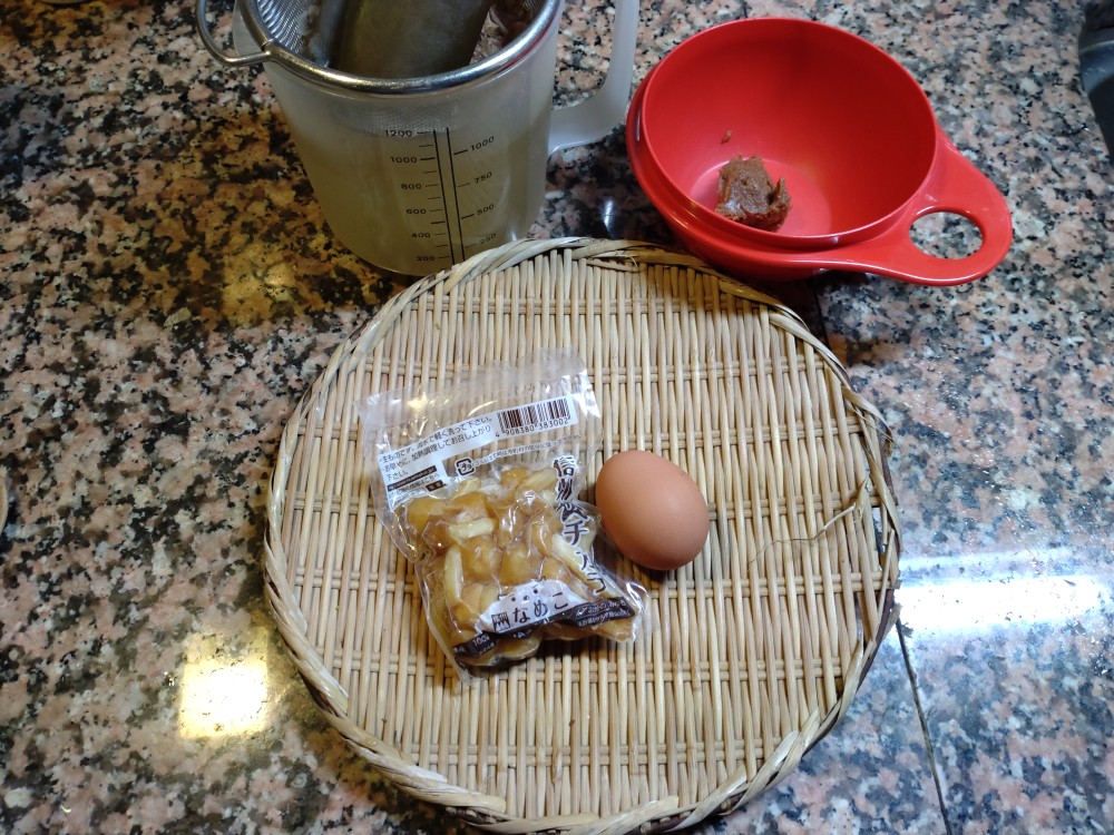 今朝は、なめこ、鶏卵の味噌汁です。
