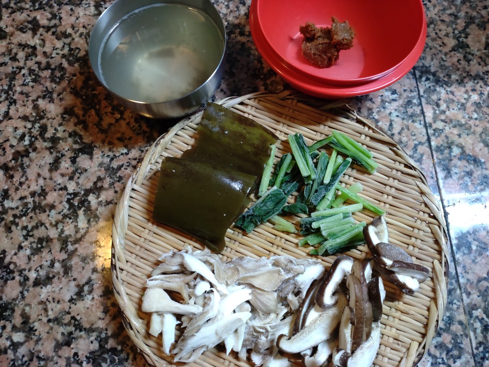 今朝は、まいたけ、生しいたけ、小かぶの葉、出汁をとった後の白口浜真昆布の味噌汁です。