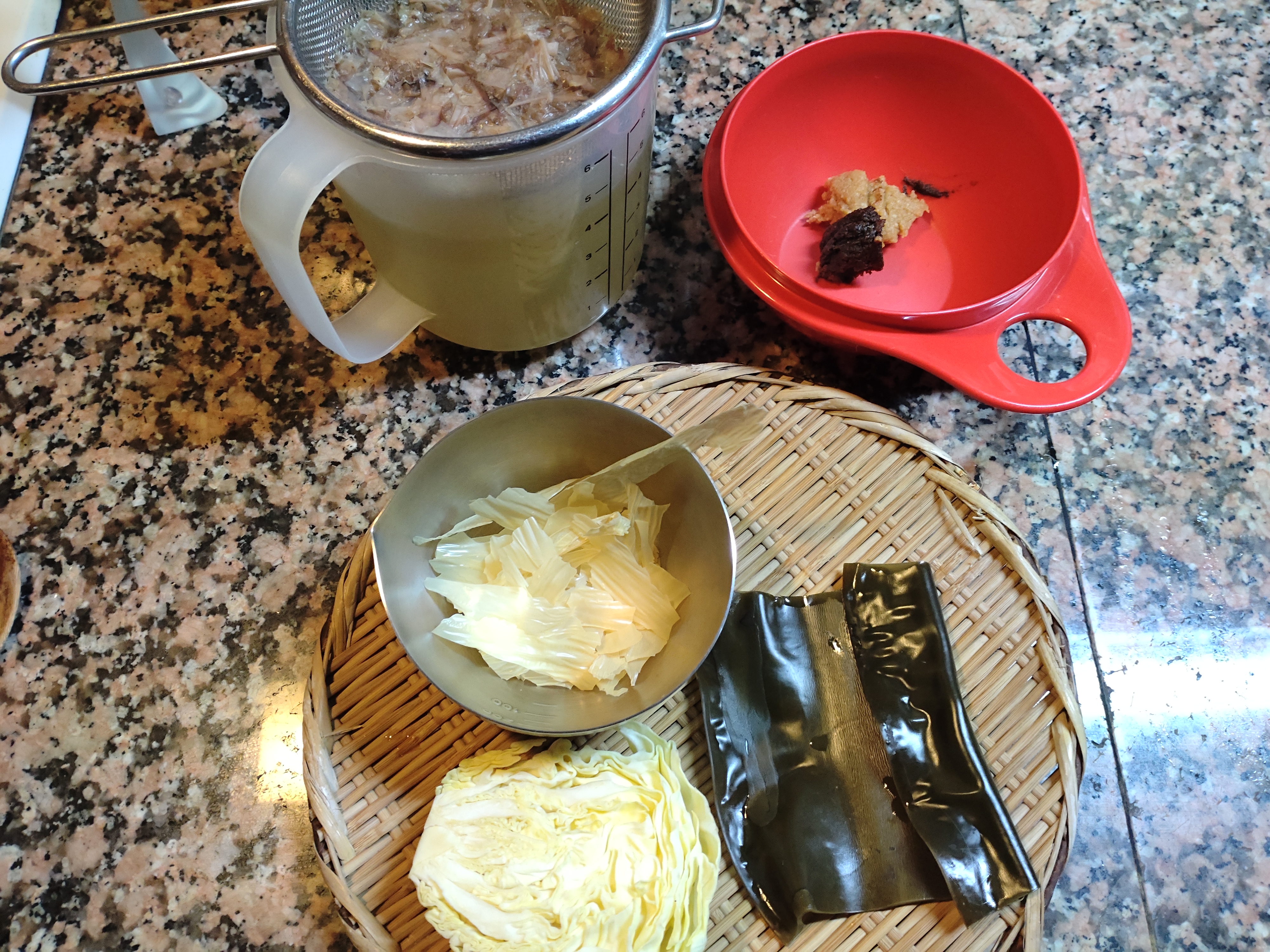 今朝は、割れ湯葉、キャベツ、出汁をとった後の日高真昆布の味噌汁です。