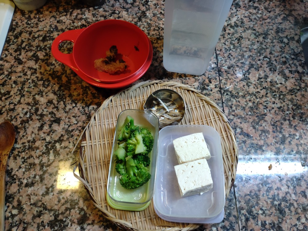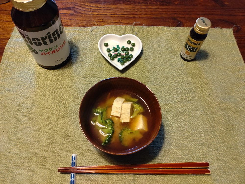 今朝は、ブロッコリー、木綿豆腐、いりこの味噌汁です。