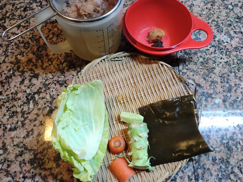 今朝は、ブッコーリの軸、キャベツ、にんじん、出汁をとったあとの日高真昆布の味噌汁です。