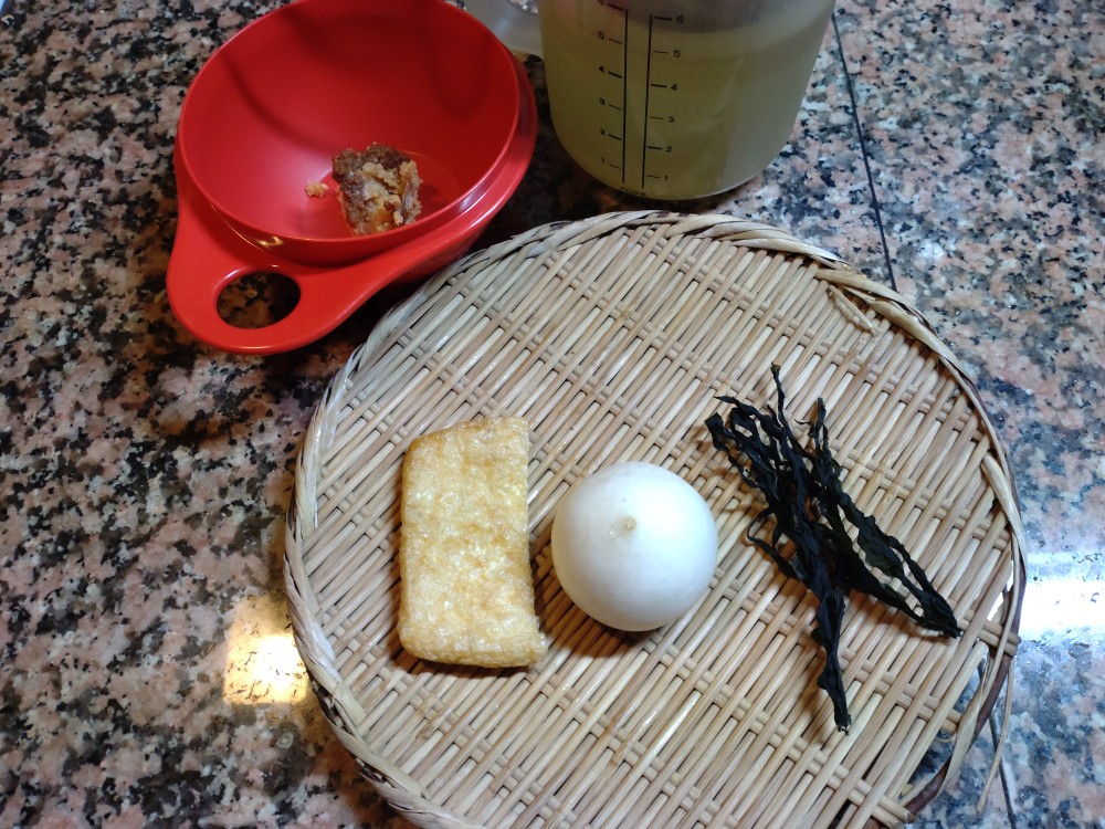 今朝は、小かぶ、わかめ、うすあげの味噌汁です。