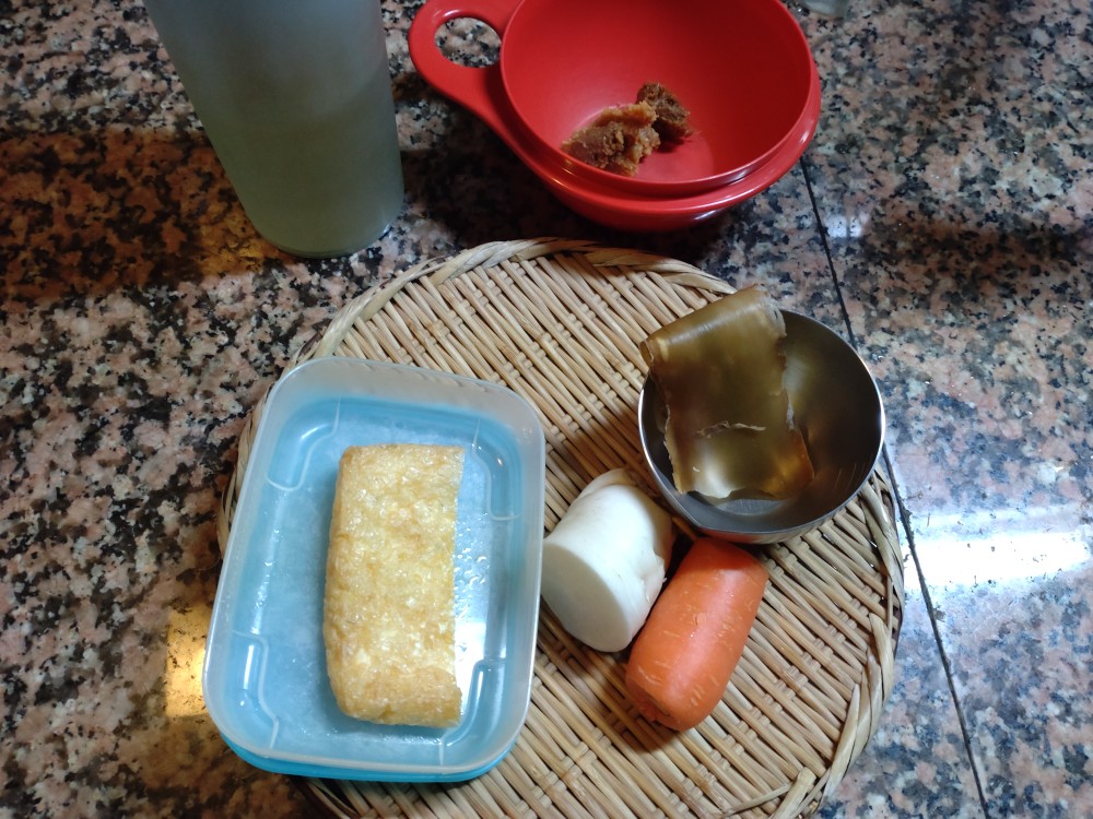今朝は、大根、人参、うすあげ、出汁をとった後の羅臼昆布です。