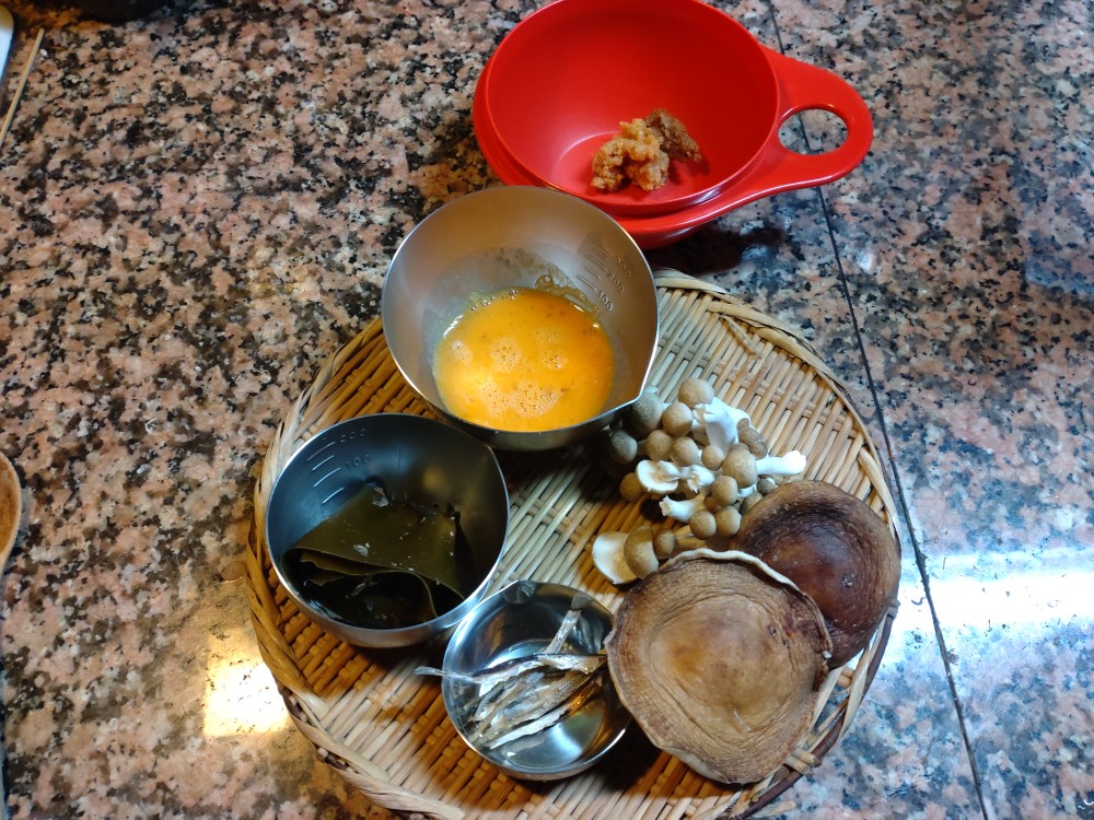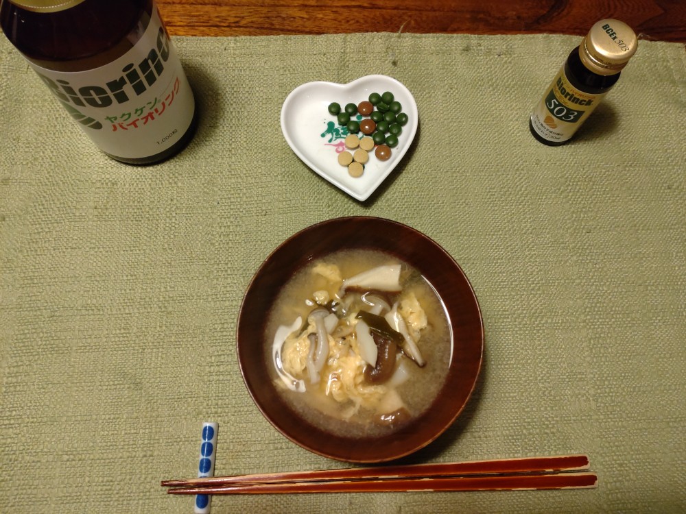 今朝は、いりこ、生しいたけ、しめじ、出汁をとったあとの日高昆布、溶き卵の味噌汁です。