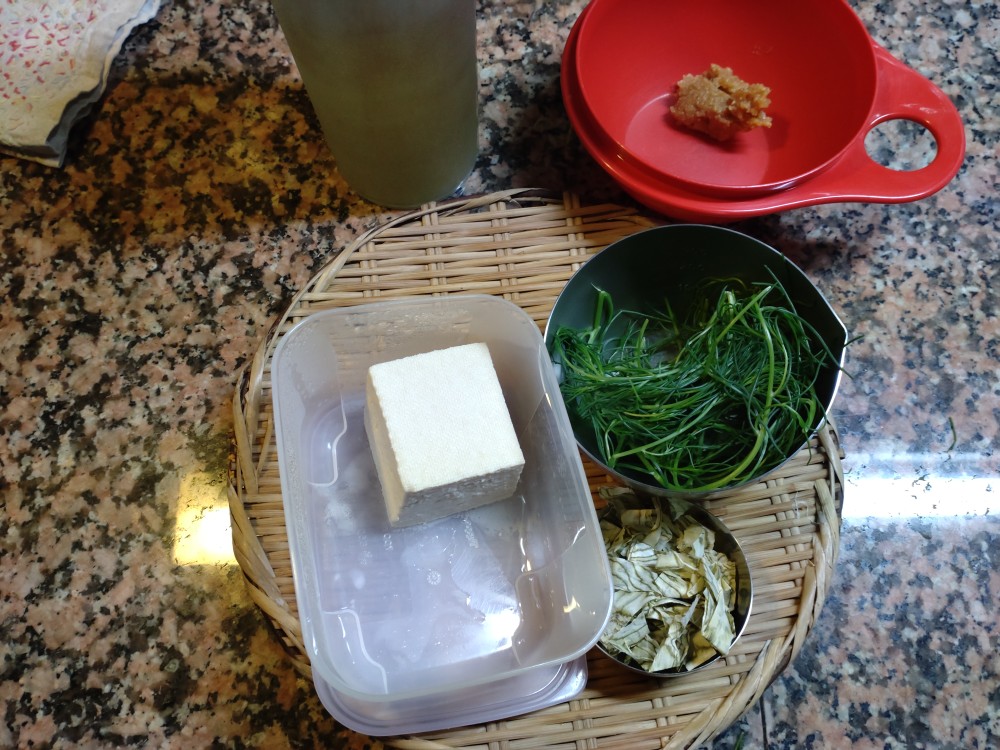 今朝は、木綿豆腐、おかひじき、おぼろ昆布の味噌汁です。