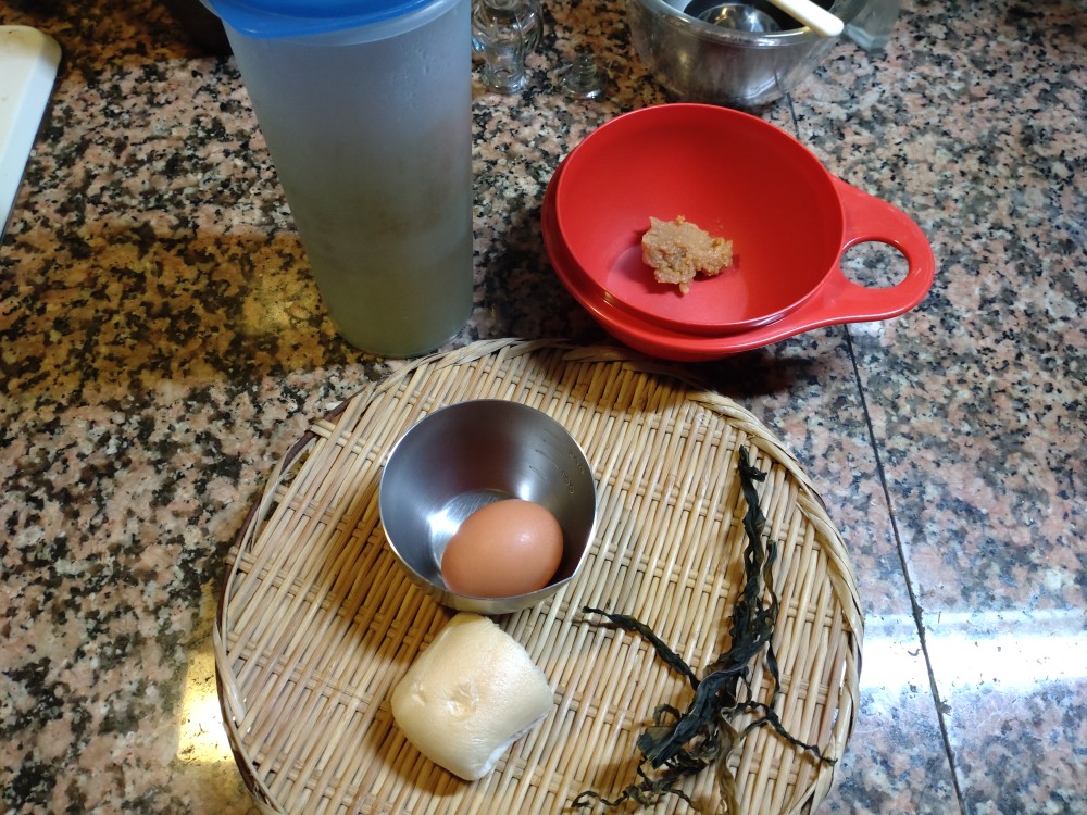 今朝は、やまいも麩、鶏卵、わかめの味噌汁です。