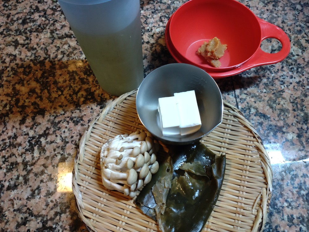 今朝は、しめじ、絹ごし豆腐、出汁をとったあとの羅臼昆布の味噌汁です。