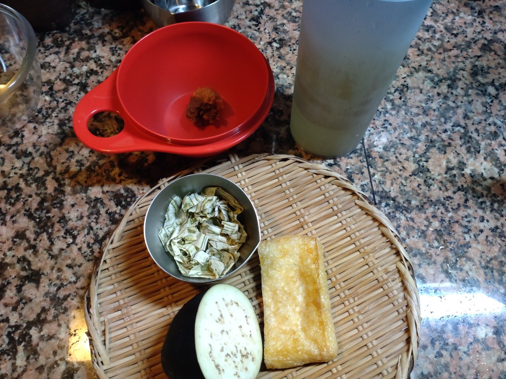 今朝は、米茄子、うすあげ、おぼろ昆布の味噌汁です。