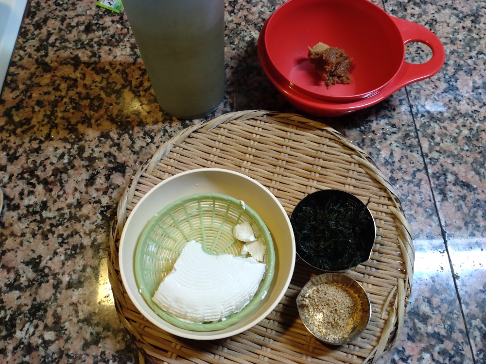 今朝は、昨晩の残りのざる豆腐、あおさ入り海苔、すり胡麻の味噌汁です。