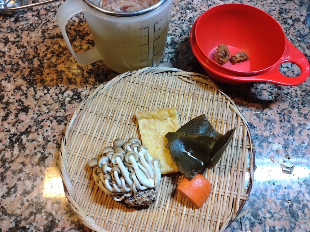 今朝は、しめじ、うすあげ、人参、出汁をとったあとの羅臼昆布の味噌汁です。