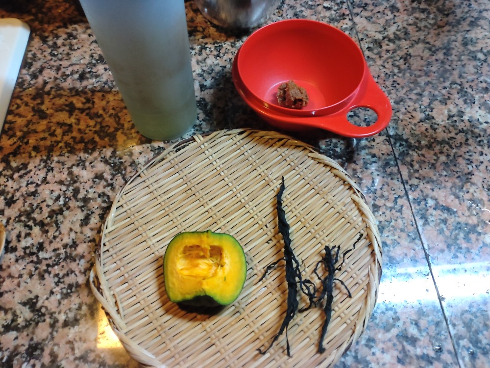今朝は、坊ちゃんかぼちゃ、わかめの味噌汁です。