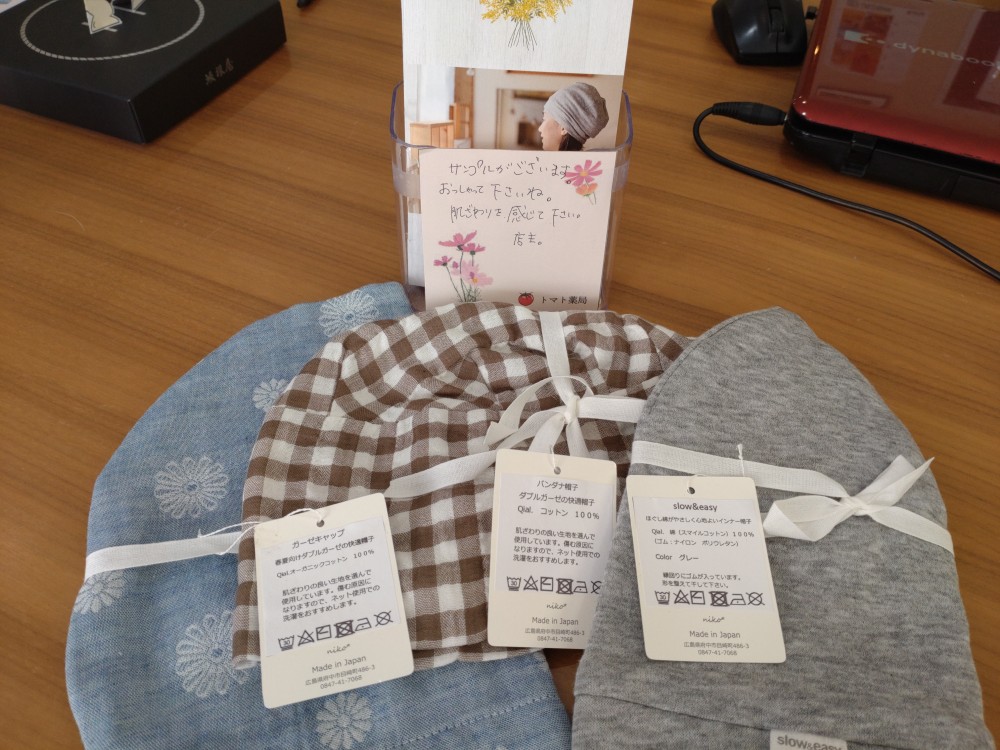 トマト薬局にも、帽子のサンプルを置いていますので、肌触りや被り心地を感じてくださいね。