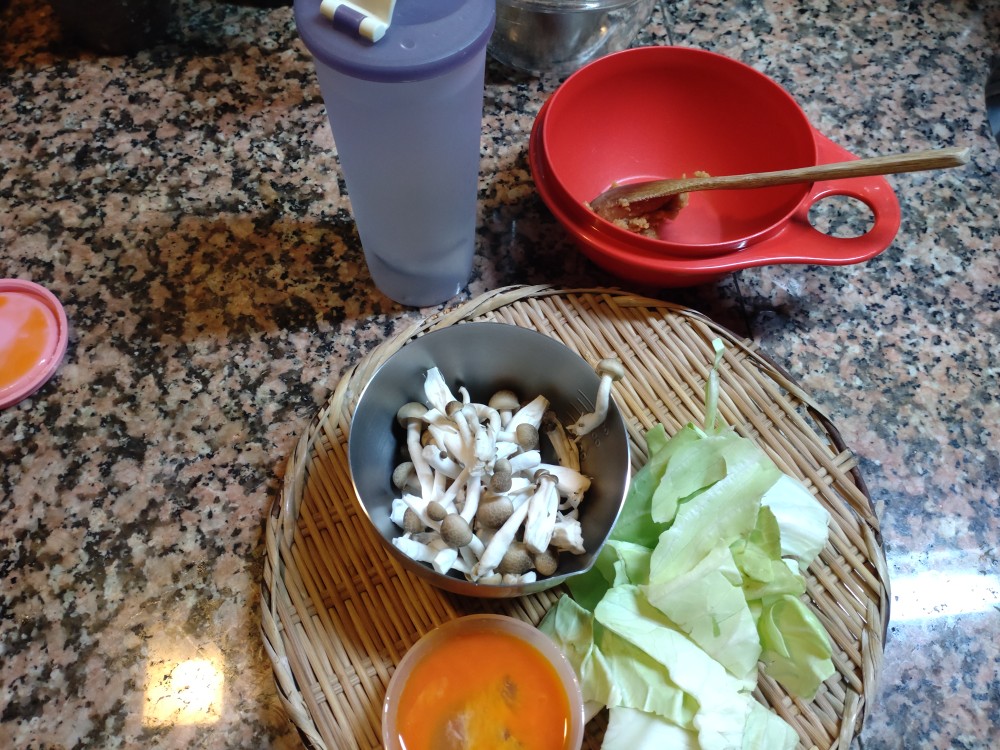 今朝は、しめじ、キャベツ、鶏卵の味噌汁です。