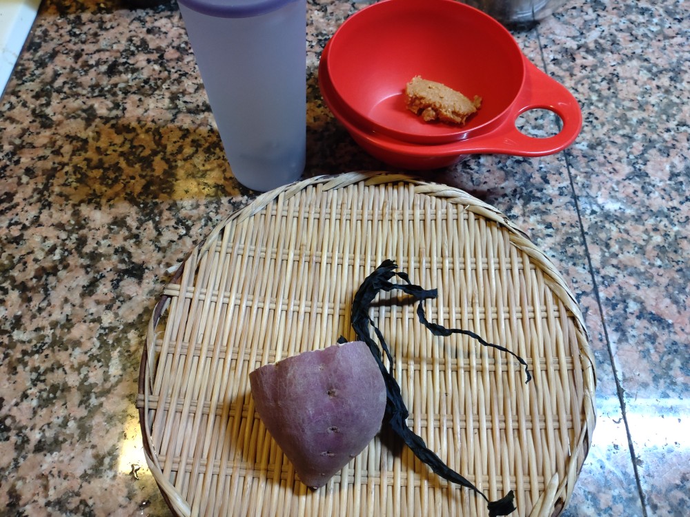 今朝は、大根の皮、さつまいも、鶏卵、出汁をとった後の羅臼昆布の味噌汁です。