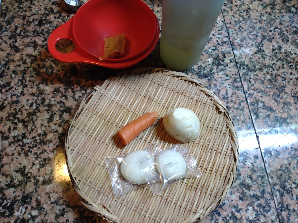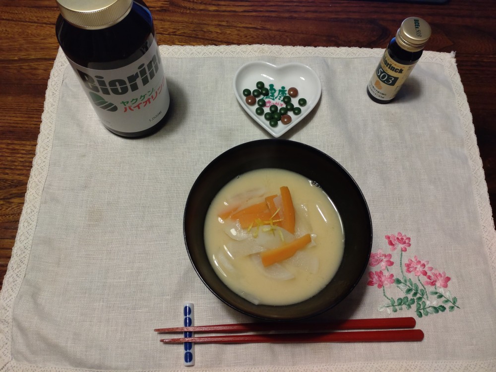 今朝は、大根、人参、お餅、白味噌仕立てのお雑煮です。