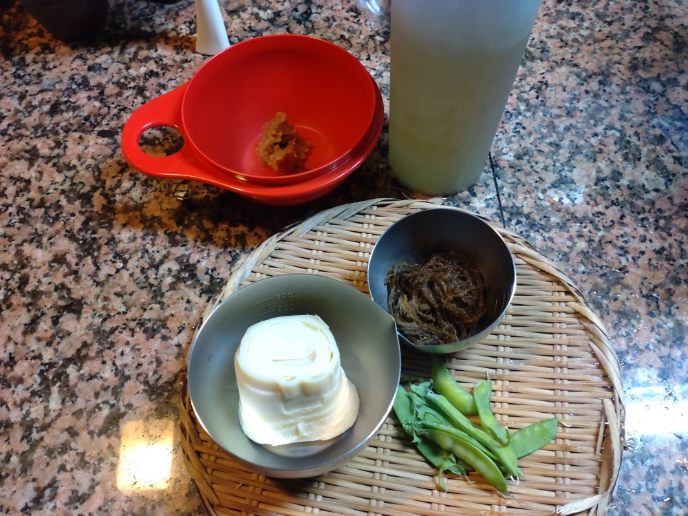 今朝は、筍、もずく、きぬさやの味噌汁です。