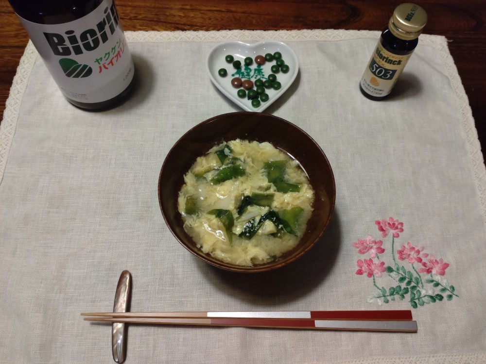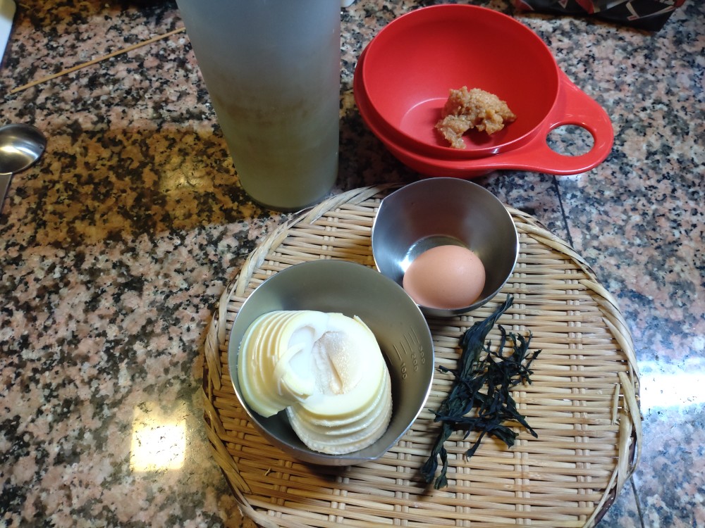 今朝は、たけのこ、わかめ、溶き卵の味噌汁です。