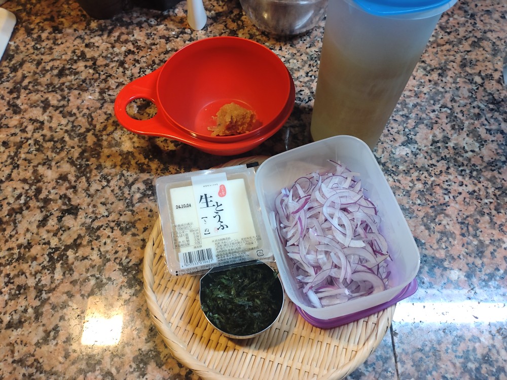 今朝は、絹ごし豆腐、赤たまねぎ、あおさ入りつまみ海苔の味噌汁です。