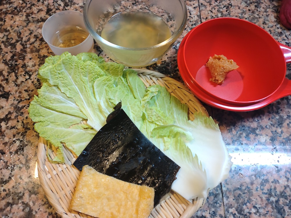 今朝は、白菜、出汁をとったあとの羅臼昆布、うすあげの味噌汁です。