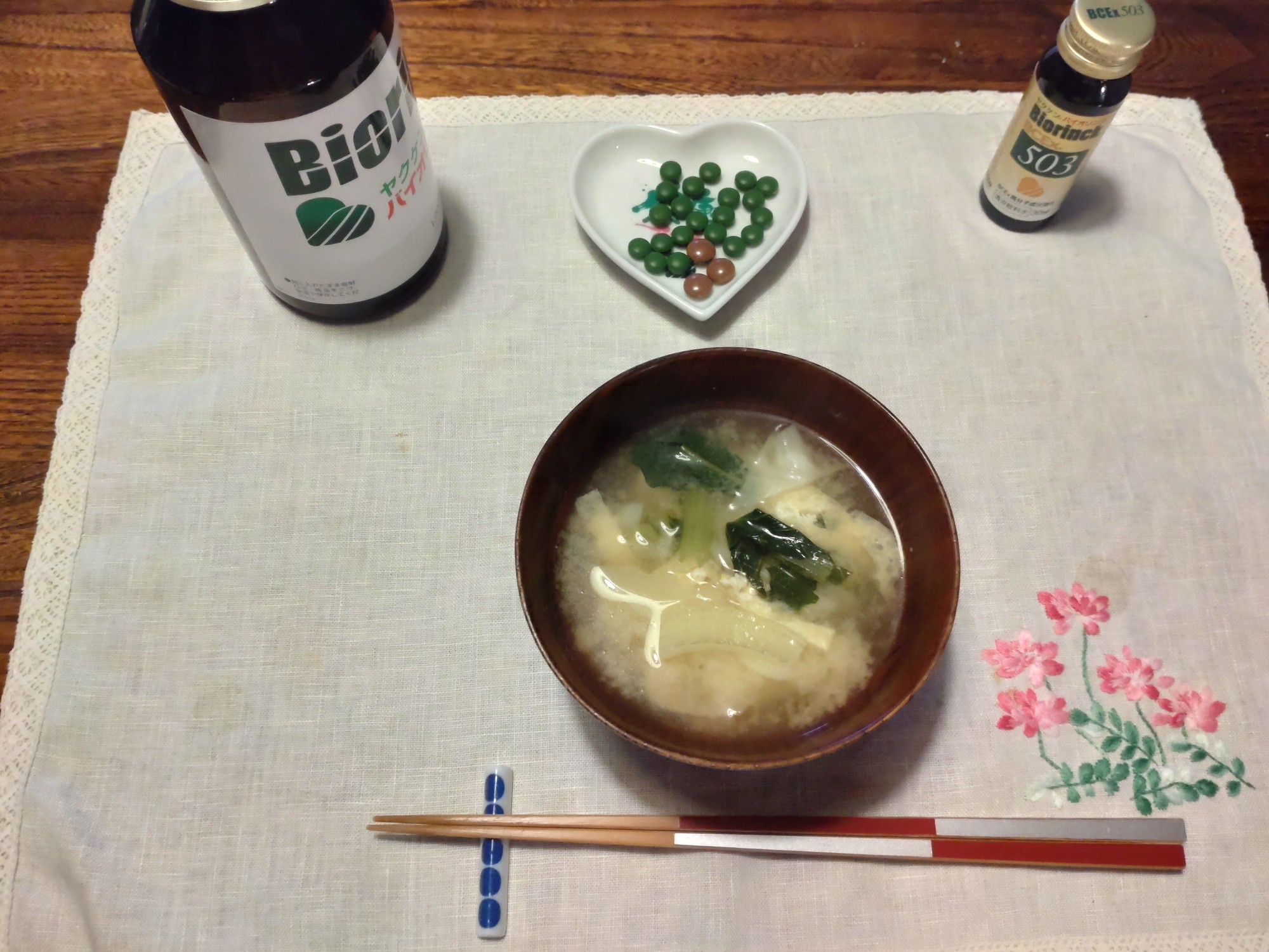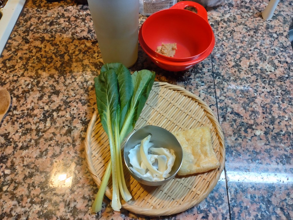 今朝は、小松菜、キャベツの芯、うすあげの味噌汁です。