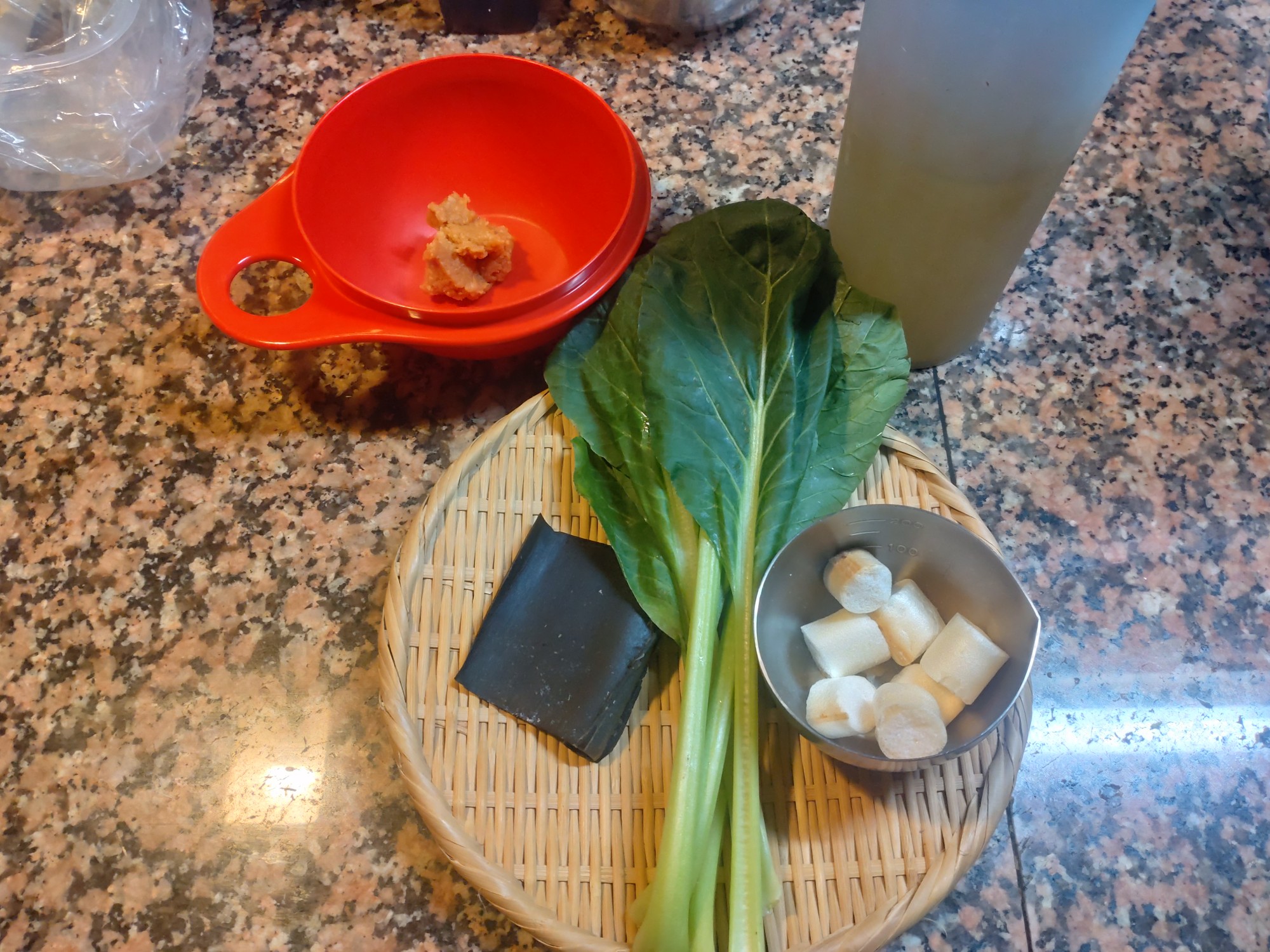 今朝は、小松菜、出汁をとった後の羅臼昆布、焼き麩の味噌汁です。