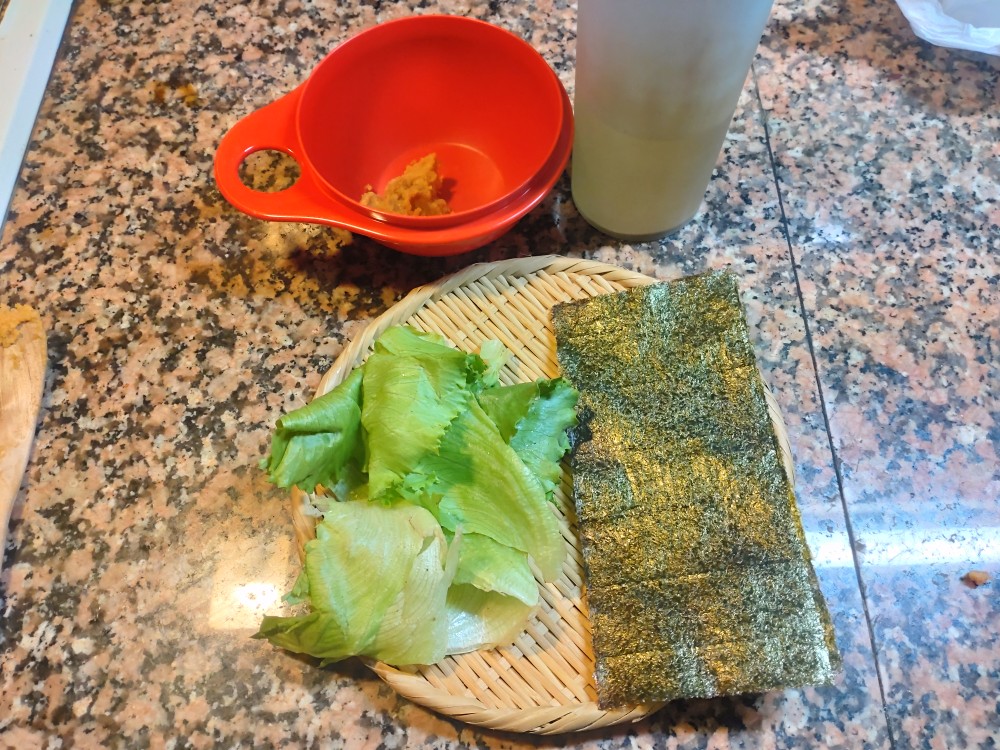 今朝は、レタス、成清海苔店さんの寿司はね焼き海苔の味噌汁です。