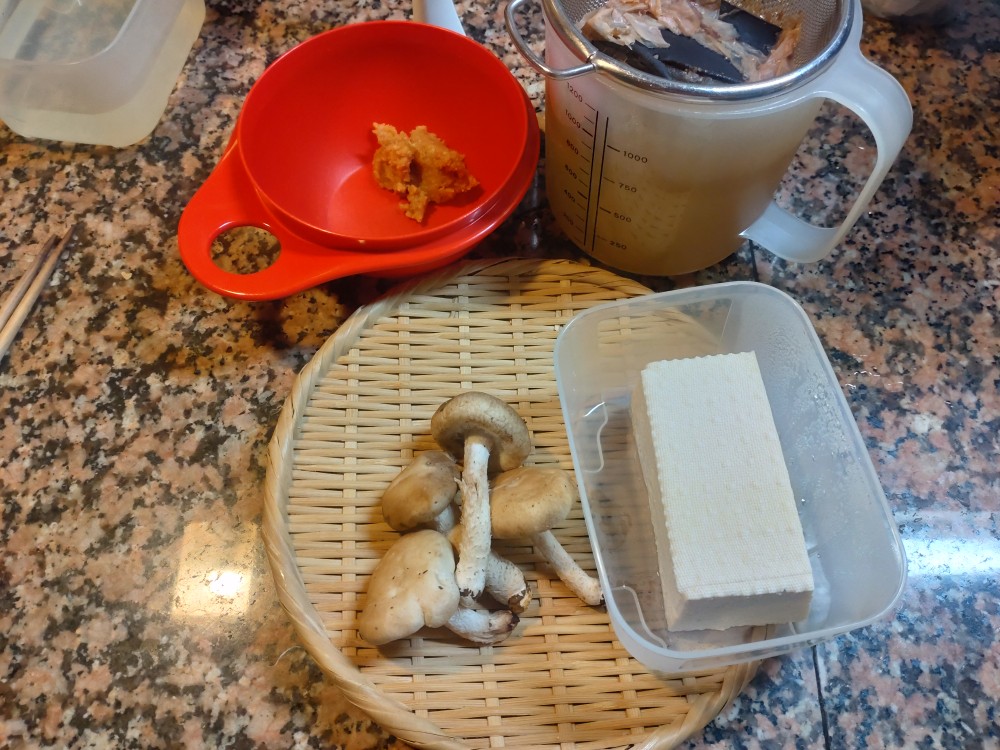 今朝は、木綿豆腐、生しいたけの味噌汁です。