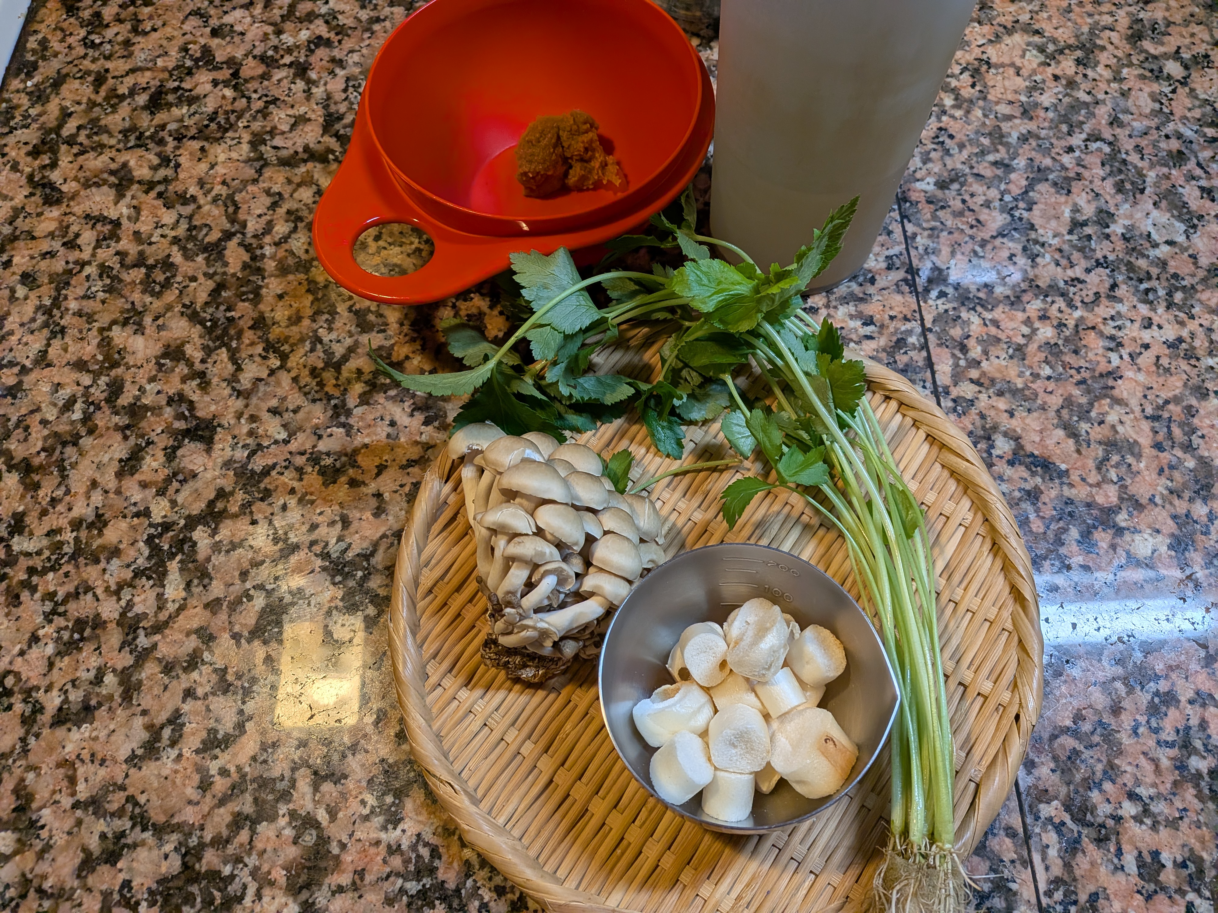 今朝は、しめじ、焼き麩、みつ葉の味噌汁です。