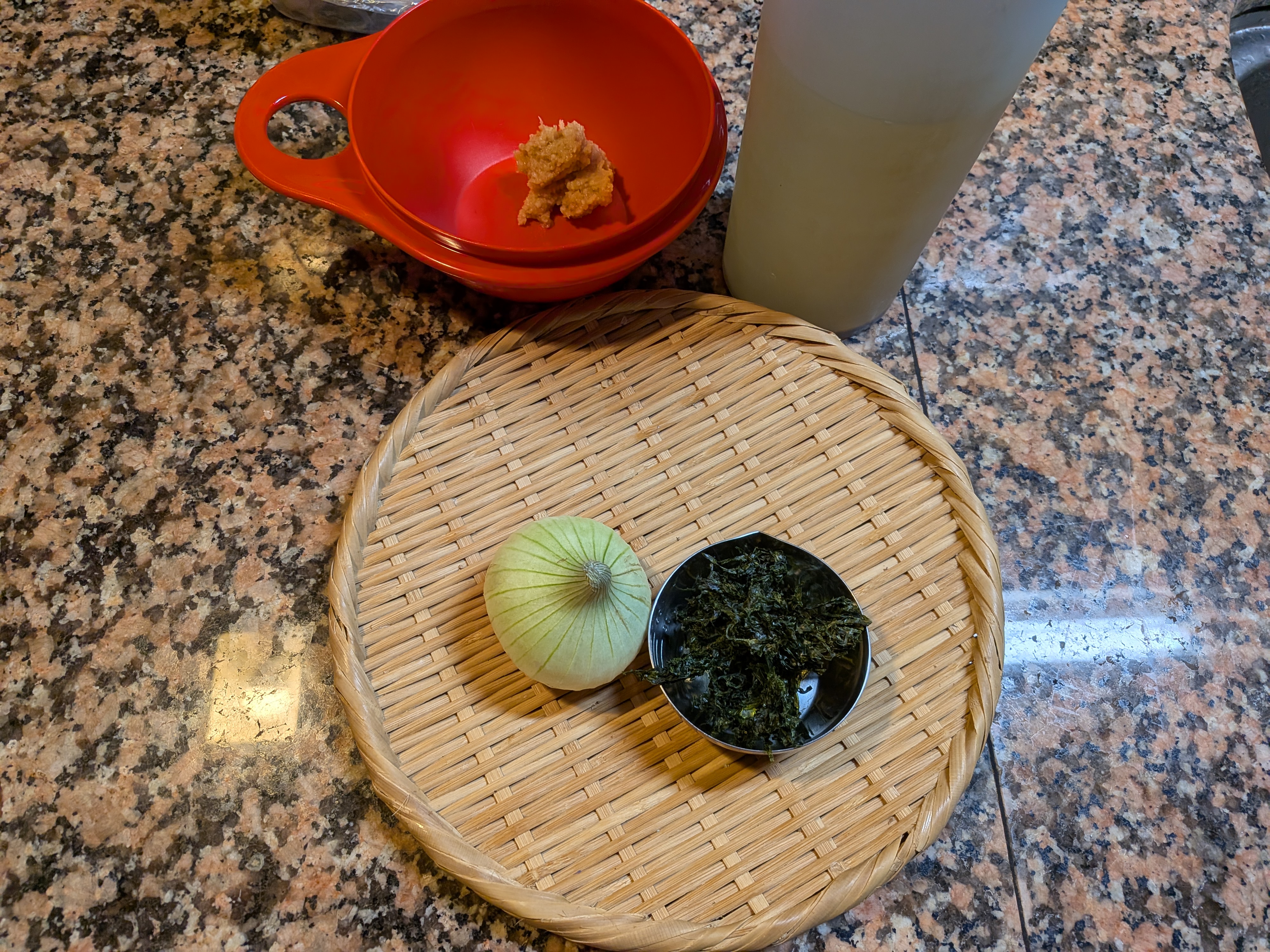今朝は、新玉ねぎ、あおさの味噌汁です。